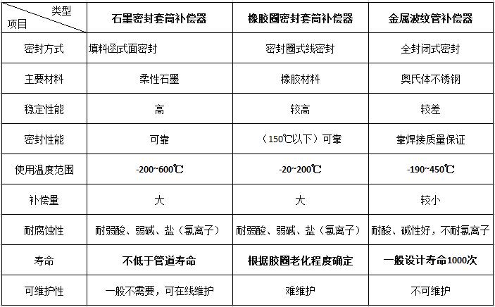 一.补偿器性能比较表